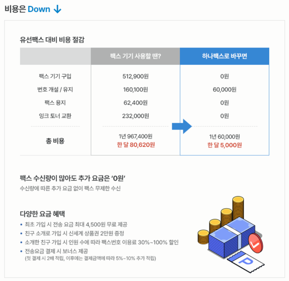 하나팩스는 이메일을 보내듯이 복잡한 업무를 간편하게 처리할 수 있는 혁신적인 서비스입니다. 웹이나 핸드폰으로 사진을 찍어서 보내면 되며, 일반 요금보다 훨씬 저렴한 가격으로 이용할 수 있습니다. 특히, 사무실 이전 시에도 기기를 옮기지 않고도 동일한 번호로 핸드폰으로 정보를 받아볼 수 있다는 점은 매우 큰 장점입니다.